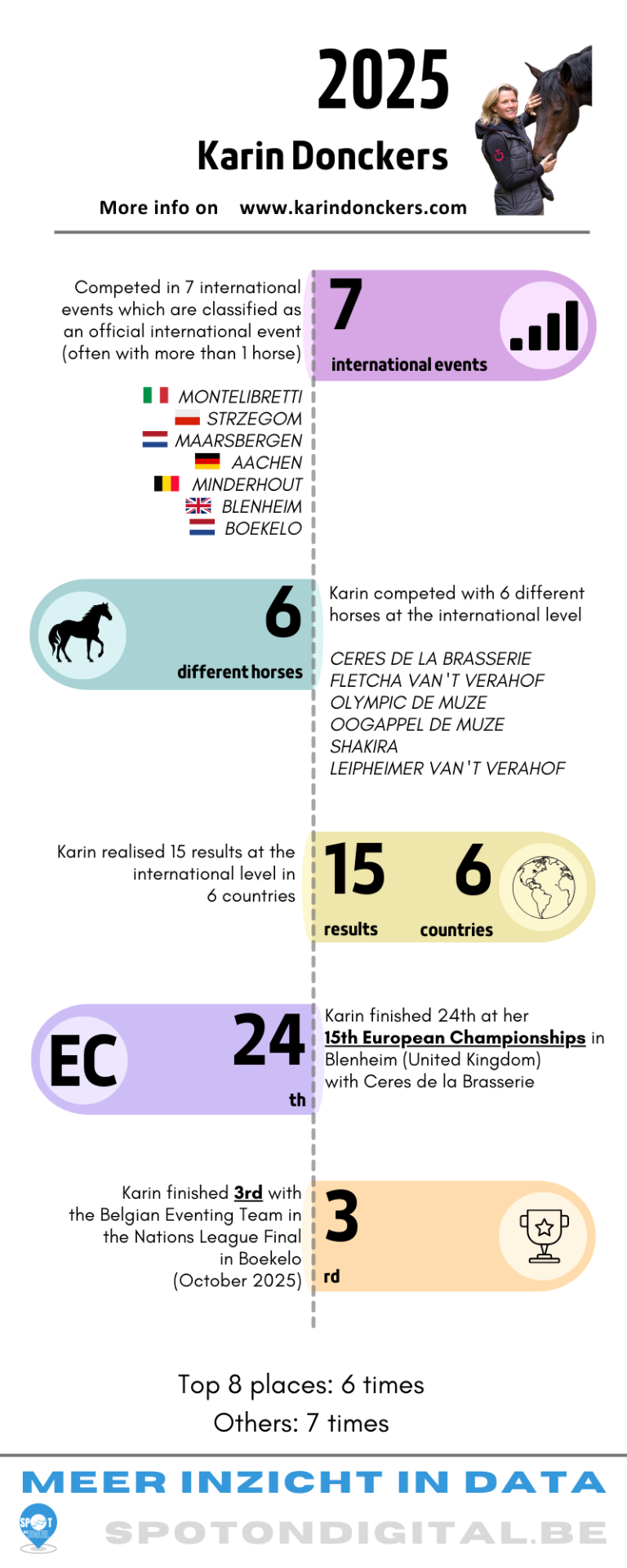 - een volledig interactief dashboard met alle resultaten uit de 38-jaar topsport van Karin (resultaten op OS, WK, EK), paarden, ...